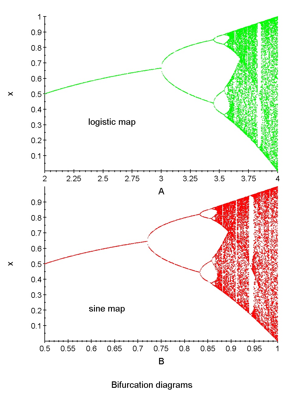 Comparison of the bifurcation diagrams of the logistic and sine maps