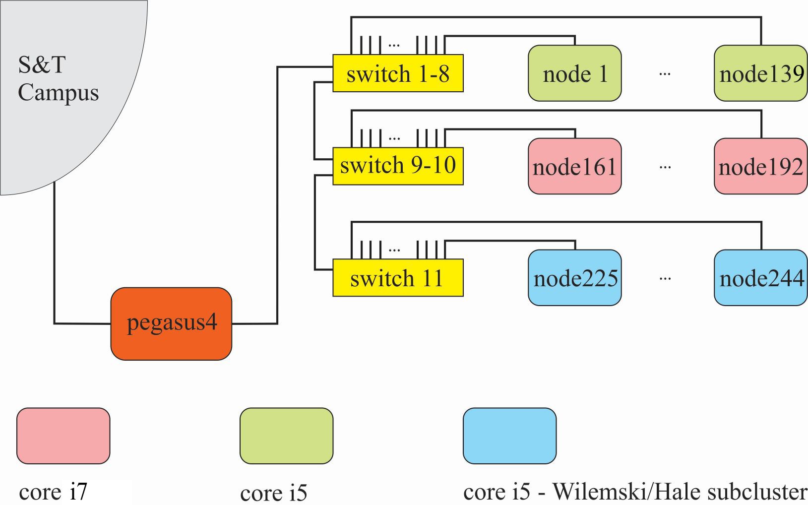 - cluster server pegasus4 has two network interfaces, one connects to the Missouri S&T campus network (131.151.x.x) and Internet